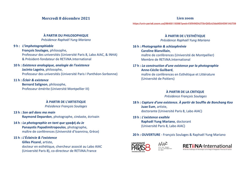 Peut-être alors que le concept d’existence éclairera (autrement) la réflexion sur la photographie; peut-être même que la photographie enrichira le concept d’existence. Tel est le double enjeu de cette rencontre de 2021.