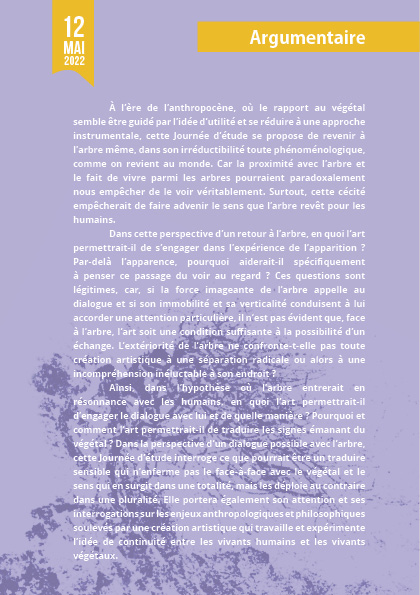 Ainsi, dans l’hypothèse où l’arbre entrerait en résonnance avec les humains, en quoi l’art permettrait-il d’engager le dialogue avec lui et de quelle manière ? Pourquoi et comment l’art permettrait-il de traduire les signes émanant du végétal ? Dans la perspective d’un dialogue possible avec l’arbre, cette Journée d’étude interroge ce que pourrait être un traduire sensible qui n’enferme pas le face-à-face avec le végétal et le sens qui en surgit dans une totalité, mais les déploie au contraire dans une pluralité. Elle portera également son attention et ses interrogations sur les enjeux anthropologiques et philosophiques soulevés par une création artistique qui travaille et expérimente l’idée de continuité entre les vivants humains et les vivants végétaux.